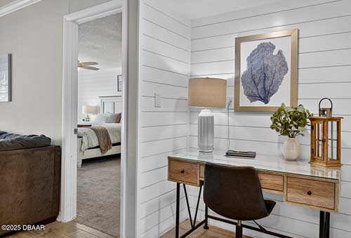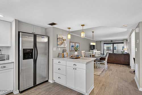 Welcome to this beautifully updated two-bedroom, two-bathroom residence in Indies House Condominium, ideally located in Ormond Beach. From the moment you step inside, you’re greeted by an abundance of natural light, updated lighting throughout, and elegant wood-look tile flooring that flows seamlessly through the main living areas. The kitchen is both stylish and functional, featuring quartz countertops, new appliances, and classic shaker cabinetry. Just beyond the kitchen is a dedicated dining space with a built-in desk, perfect for remote work or organization. The living room opens to hurricane-impact sliding glass doors that lead to a private balcony, where you can enjoy beautiful ocean views overlooking the pool and take in the coastal breeze.
