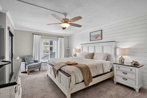 The primary suite offers a peaceful retreat with a spacious walk-in closet, direct balcony access through storm-rated sliders, and stunning ocean views, ideal for waking up to vibrant sunrises. The en-suite bathroom has been thoughtfully updated with quartz countertops and a beautifully finished walk-in shower. Toward the front of the unit, a hallway leads to the guest bedroom and a fully updated guest bathroom with a tub/shower combo. Both bedrooms are carpeted for added comfort.